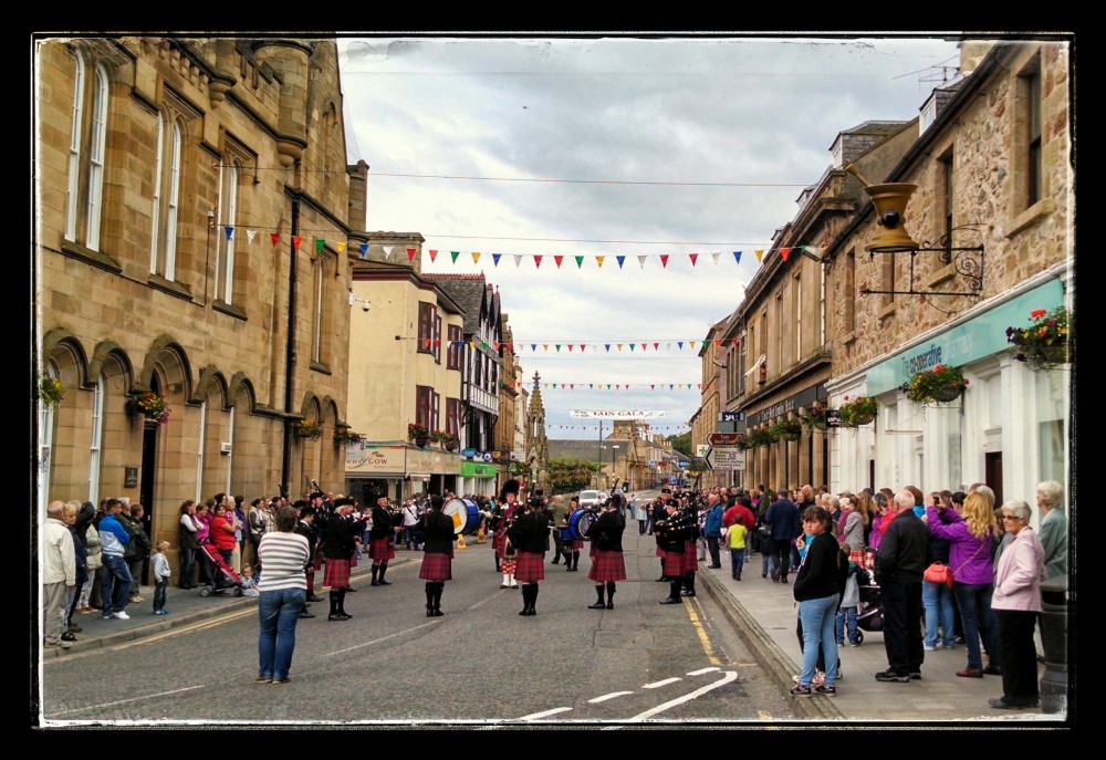 We got back to Tain at 8 o’clock. Our trousers had mostly dried out with the car heating. But our shoes were still damp. Nevertheless we headed straight to the Royal Hotel. Next door to our host house because of hunger pains! In the main street, outside the Royal Hotel, the Tain Pipe Highland Band were playing away. They were the full regalia with the Major twirling his big baton too. They were welcoming us back!