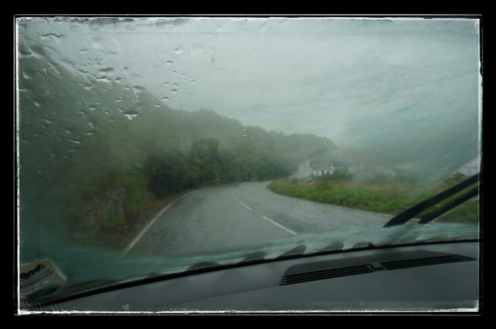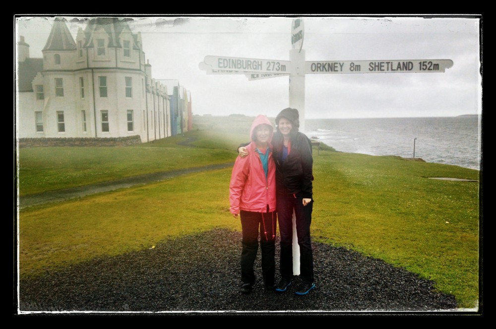 So we decided to keep heading north and drive a couple of hours to John o’ Groats. Traditionally called the First and Last of Scotland. It’s in the north-west. Have I mentioned that John’s car that we’re driving has a few quirks? Turns out that defogging isn’t one of its strengths. So as we drove along, Rosie had to lean over and constantly wipe my side of the windscreen clear so I could see where I was driving. It was raining so hard we couldn’t make out the ocean to the right of us.  Couldn’t see much of the hills and countryside to the right of us either.